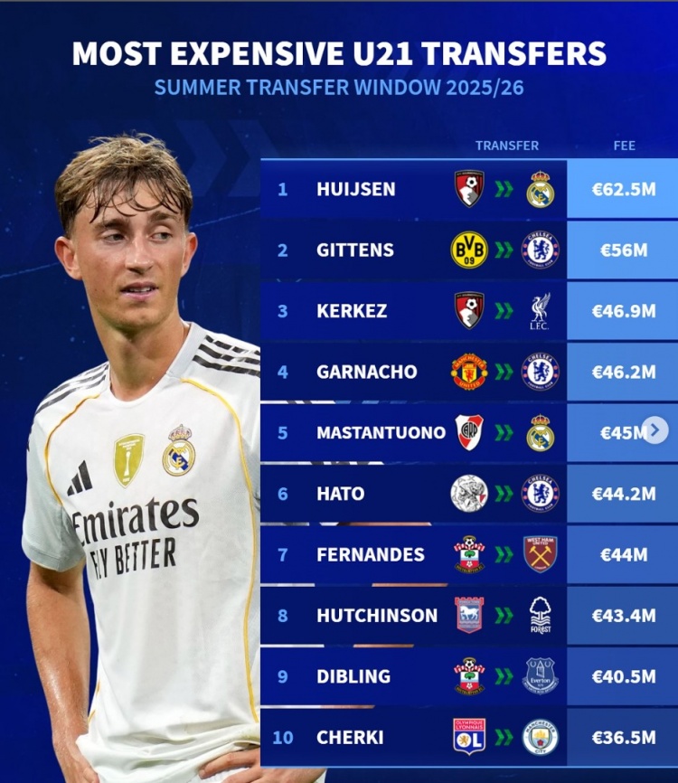 9月5日讯 《转会市场》统计了今夏的U21球员最贵转会费榜单,皇马6250万签下赫伊森居首。